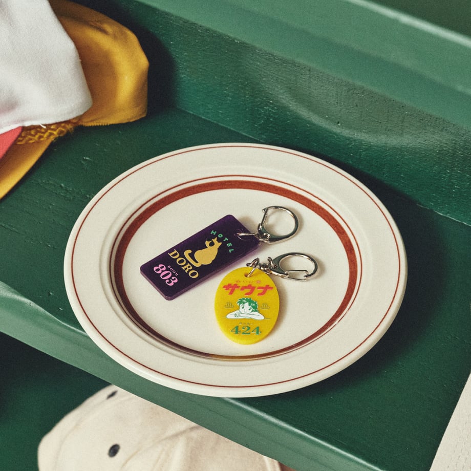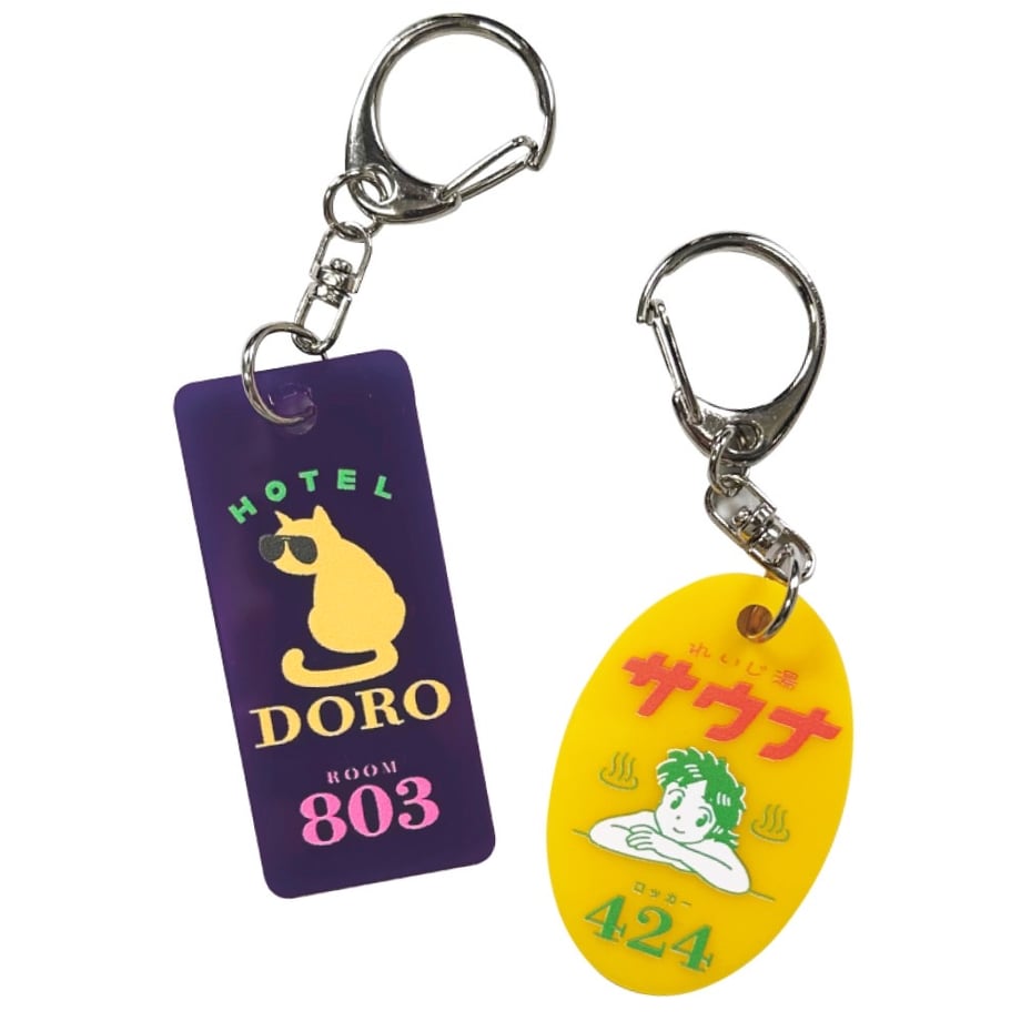 銭湯のロッカーキーと、ホテルキーを模したアクリルタグ。